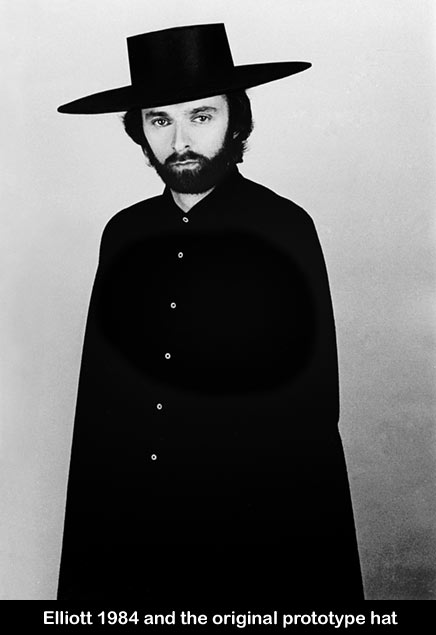 Elliott also created his first hat in 1984 after several disastrous attempts with hatters. Despite his attempts to abandon them, on many occasions over the years, their popularity with the public, collectors and friends alike, has kept them current. He made them himself for 23 years, eventually delegating to the Spanish in 2007. Even they initially declined the challenge. Elliott's hats have the world's largest straight-as-a-blade brim.