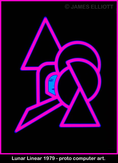 Elliott creates his first work which was a glimpse of the ground-breaking cyber art to come, although some say that accolade belongs to 'Metasphere' 1974+5. It is worth noting here, that right from square one Elliott pursued technical virtuosity as well as creative supremacy. Note that the face in this picture can be read from a front perspective, as if wearing some sort of helmet, or in profile, like a moon drawn as a caricature in a child's story book. This was an image decades ahead of the curve. Proto computer art.