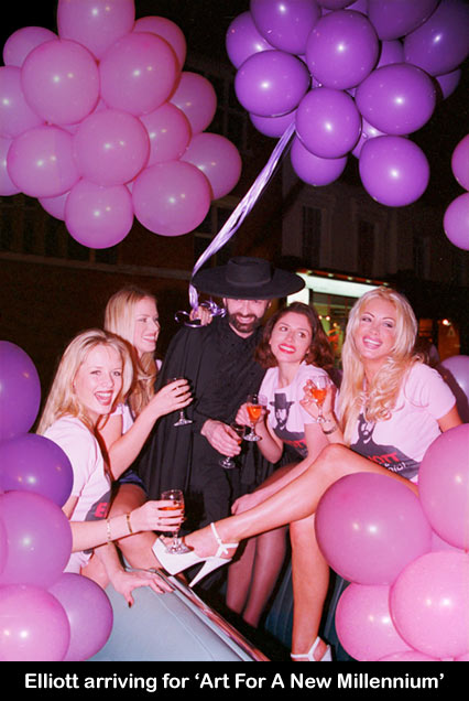 Elliott turned up in Berkeley Square to open his exhibition with two of America's top glamour queens. Balloons fell from the sky, there were top models dressed as cats, tearing each other's clothes off in Berkeley square, a video wall showing 'Voice Of A New Generation' and 100 bottles of Champagne. Elliott turned up in a convertible Rolls Royce Corniche.