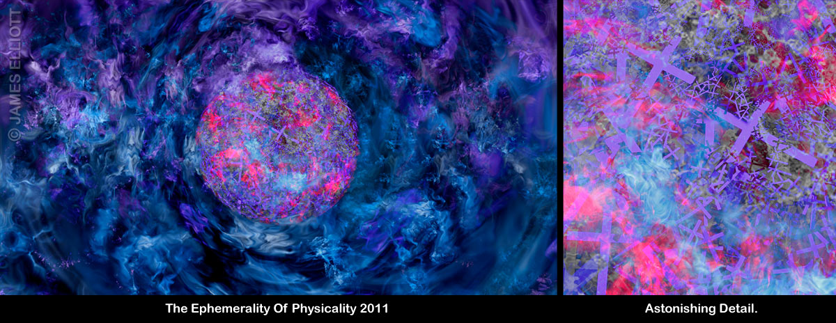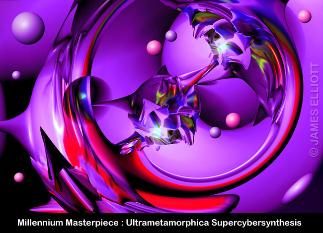 Elliott works on his 'Millennium Masterpiece, which would eventually be entitled 'Ultrametamorphica Supercybersynthesis'. This involved the use of no less than four software programs. One of these was cutting edge at the time, but has since disappeared. This happens often and much of Elliott's pioneering work is unrepeatable, due to obsolete software engines.