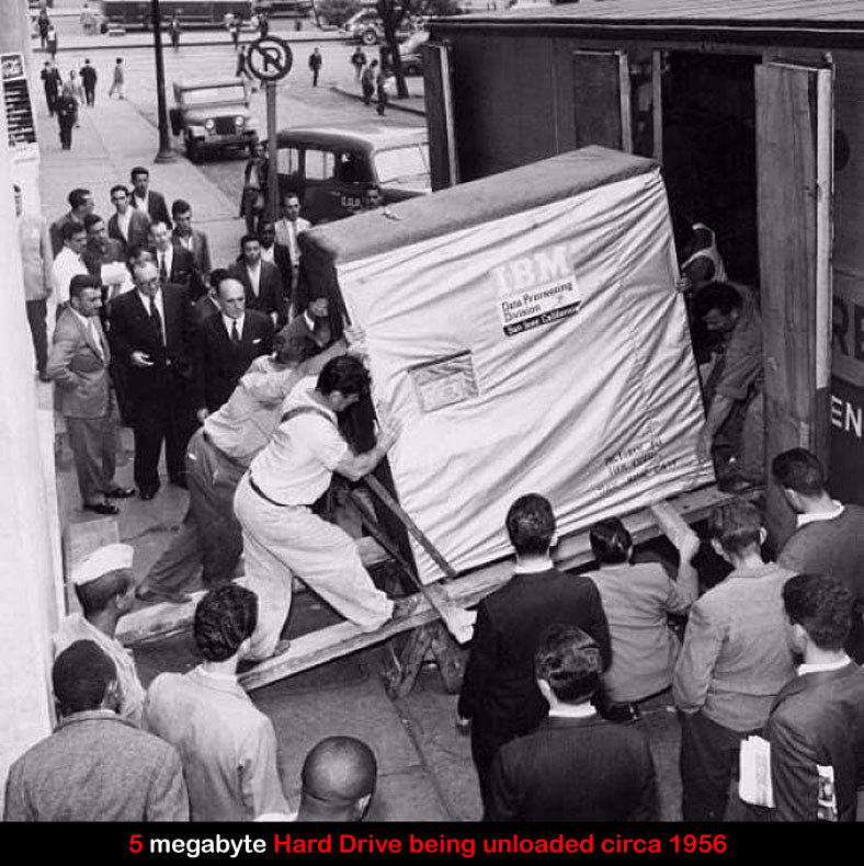 Proto-digital if ever there was. These tapes were in a language that mainframe computers at company headquarters could understand. Also, in the Sixties a teenage friend of mine was a computer programmer. So even in those days computers were around, at least in the background. Mainly used by the large companies who could afford them. But individuals did not own them, they were too bulky and expensive. The first hard drive was invented in my lifetime. By IBM in fact. This was in 1956 and it was called RAMAC, which was an acronym for Random Access Method of Accounting and Control. If you want an overview of how far we have come in just over sixty years, take a look at this picture of a 5 megabyte hard drive being unloaded.