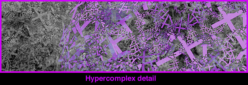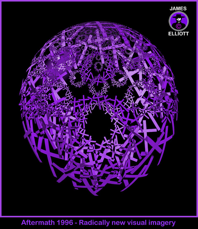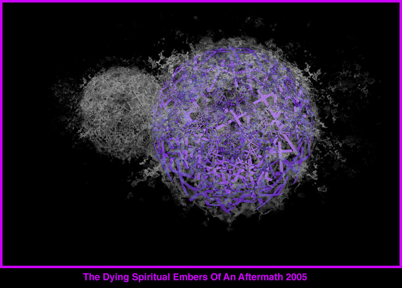 Movies are very different to the creation of photographic art. In some ways movies are closer to music in that they have a dynamic which can be used to create a climactic narrative. Photo Art is more to do with capturing said climax so that it can be suspended in time for all eternity. The improvements of the new Super VHS over standard VHS video were huge. I would freeze-frame images and look at them. Some were gorgeous! Though not technically good enough for serious photography. I thought back then that what I want from the future, was an imaging machine to do video of extremely high resolution that I can run in still mode at 25 frames per second with photographic resolution! I mentioned this idea back in the early Nineties, in a published interview. Amazingly, most of this has now come to pass. Interestingly the solution was at first the opposite of what I envisaged. Video was added to stills cameras. With the latest mirrorless cameras, this has switched back again and they are nearer video cameras with a higher resolution still option. Just all round imaging machines. Does that take all the Art out of Photography? No, not the art, just a little of the timing skill. Anyone who thinks it takes the art out of photography, has no understanding of what an artist is, or does. I left observational recording behind 50 years ago. There is an ocean of difference between snapshots, however well timed and artistic masterpieces pulled straight out of the imagination. Only the latter says anything much about the artist and his mind. It was indeed the observational recording of the previous generations that I rejected as Art. They did too. The other thing about Kalachnikoff shooting at 20 frames a second, is that amazingly it often misses the peak moment. And your brain can surprisingly, very often capture it, if you have swift reflexes. I did on a few occasions use a video frame as input for the starting point of a work of art. In 2005, a breakthrough image was 'The Dying Spiritual Embers Of An Aftermath'. The complexity of form is unprecedented in art and I would argue, impossible by any another means than cyber art. It started with a number of actual physical crosses I had made, about 40 I would say. These were made of wood, were about 12cm high and made with cross halving joints. I then painted them lilac. This I had done a couple of decades earlier in Cricklewood in when I was working on the masterpiece 'The Inevitability Of Circumstance', the penultimate picture I created there.