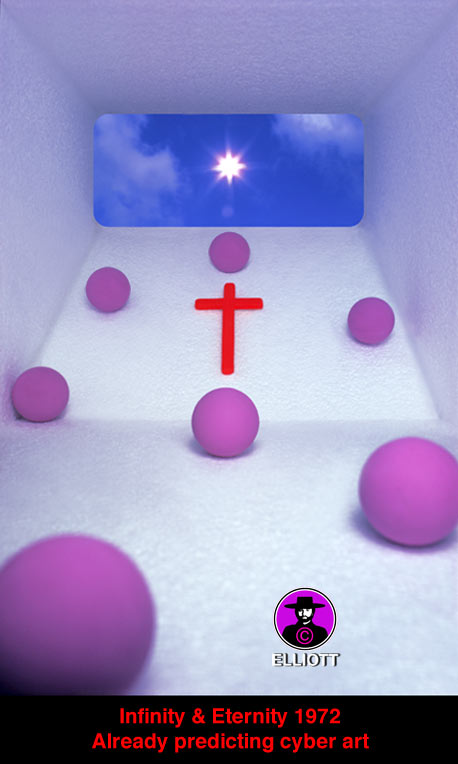 I always had this awareness of computers and technology. My interest in electronic music also goes back to the late Sixties. I saw the first ever Moog electronic synthesiser played on stage in 1969 by Keith Emerson at the Isle of Wight Pop Festival. I was 18 at the time. And I just thought, 'Wow! That is incredible! Exhilarating! And so new!' "Music will all be like this by 1973", I confidently predicted to all and sundry. Little did I know way back then, that my ability to critically assess something and extrapolate, free of prejudice, was a gift from the Gods. As Montaigne said "In the judgment of great things, a soul of equal stature is required." I just always assumed everyone had this sort of perspicacity. And indeed my perfectionism. How wrong I was. This was also of course, the reason I took up Photography and not Painting. It was just a mystery to me, that the world and his wife couldn't see how obviously superior Photography was! Vestiges of prejudice from a half past world, no doubt. Perhaps this explains to some extent, the cyclicality of life and death. The newly born see things with fresh eyes. Not always better but at least fresh. Zero jaded prejudice. But how could Photography have been around so long, without people realising what had been invented? Maybe it was the painfully slow evolution of colour photography almost a century and a half after its monochromatic invention by Niepce. Colour was not really perfected until the late Sixties, from an accuracy of colour and permanence standpoint. I have often stated that had I been born a decade earlier, I would not have pioneered Photography as Art. The medium was not good enough for my exacting standards. Consequently I probably would not have pioneered Cyber Art either, although it's invention and perfection was very much swifter than photography. Everything happens faster these days. Regards inventors not realising the potential of their brainchild, it was similar with the laser and the microchip. Everyone knew they were breakthroughs, but no-one knew what to do with them. The challenge here is that breakthroughs most often come from the scientific domain. A scientific mind is not so much a creative one, as it is extremely ordered and rational, so often the people responsible for breakthroughs are not the people best equipped to understand their creative potential. That is not a criticism, just an observation. Art and science are simply different areas of endeavour. One of the things which makes photography unusually difficult to master is exactly that. Great photography can only emanate from a mind and brain which is artistically and scientifically evolved. This is rare, as they involve using different sides of the brain. Most people polarise towards developing one side or the other. To be a great photographer requires the mind of an artist and the brain of a scientist. With other arts, many would argue that technique is far less important. In painting, for example, any kind of approximate, slap dash effort, seems to be the order of the day. This is probably just praxis and the low standards everyone has gotten used to. With photography however, the image must be technically perfect. The medium is far less forgiving. It cannot have any flaws. So creativity and technique weigh almost evenly. Perhaps the first great image I created, which looks like it could have been created on a computer, was 'Infinity and Eternity' of 1972.