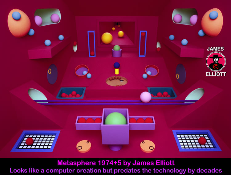 At the end of the day, masterpieces take time and there is really nothing you can do about that. I find it interesting that since I shifted the emphasis to computers in the early 90s, my prolificacy did not increase. In fact it remained EXACTLY the same, which is fascinating. Ten pictures a year. Mastery is mastery at the end of the day. Masterpieces swallow up time like a black hole swallows up light. So don't be tempted into thinking computers make art easier. They don't. Although massive experience as a photo artist, certainly worked to my advantage. Consider this:Magritte was truly awful photographer. I saw some of his snaps in a New York gallery and I just laughed. Totally inept. The fact that you can paint or sculpt will not make you a great photographer. Or cyber artist. Every art form has its own unique area of mastery. Photography and Cyber Art are no exception. In some ways they are more difficult to master than the conventional arts. Both creative supremacy AND technical technical virtuosity are required. Speaking of Surrealism, much of it is too random. What I create are imaginative, complex, synergistic, cohesive truths. Not random in the least. Easy to recognise but difficult to define, there is definitely a magic to creating art. It's that "Oh my God!" factor which one discovers during the act of creating. It was nothing a moment ago and now it is brilliant. It's like magic. The exact opposite of random. That synergistic synthesis where everything becomes greater than the sum total of its parts. When it metamorphoses into art. I always search for that. And nearly always find it. Should I not, then I abandon my creative endeavour. This philosophical bedrock has never failed me. It is a form of honesty. And a higher form of image making. So much of it is like exploring terra incognita. Running across virgin snow. It is an exhilarating pleasure to innovate. To pioneer twice in a lifetime, that is something to celebrate. JAMES ELLIOTT Written 2002, 2018 & 2020 at Abbey Road, London (well.... I had a lot of other important things to do....) JAMESELLIOTT.com 9600 words with 33 Fabadoodle Illustrations © JAMES ELLIOTT 2020