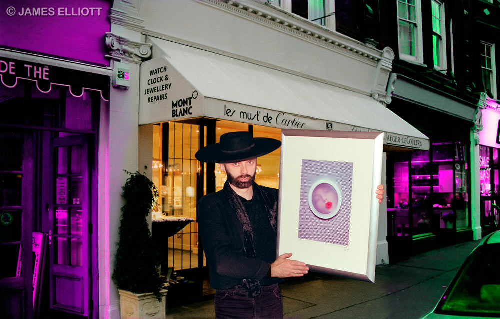 James Elliott holding world famous photo icon 'Kiss On Frosted Glass' on St John's Wood High Street in London. He lived just off the HIgh Street for a while and of course, in Abbey Road for 17 years. As EL says: "Abbey Road - famous for the world's greatest artist photographer and a not-at-all-bad pop band." Whenever you ask Elliott if he's serious or joking, he always gives the same answer: "Both". |