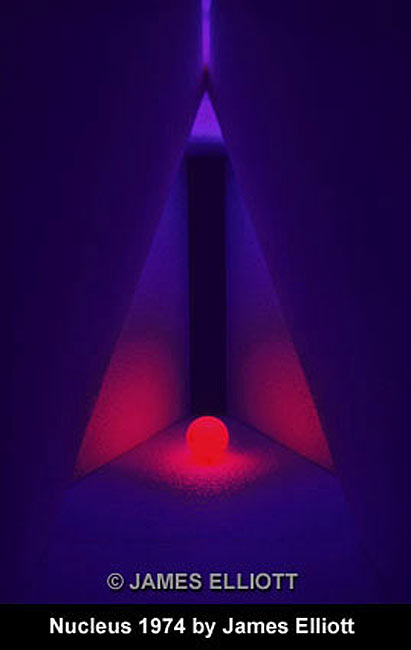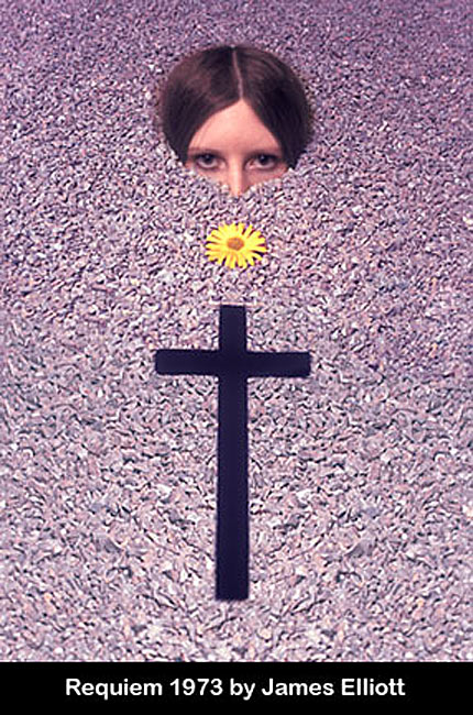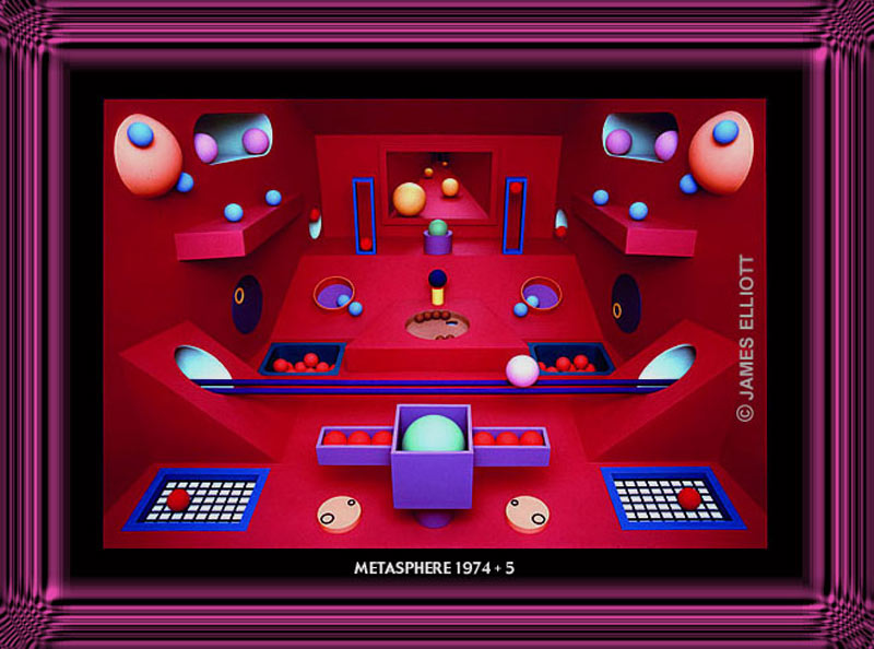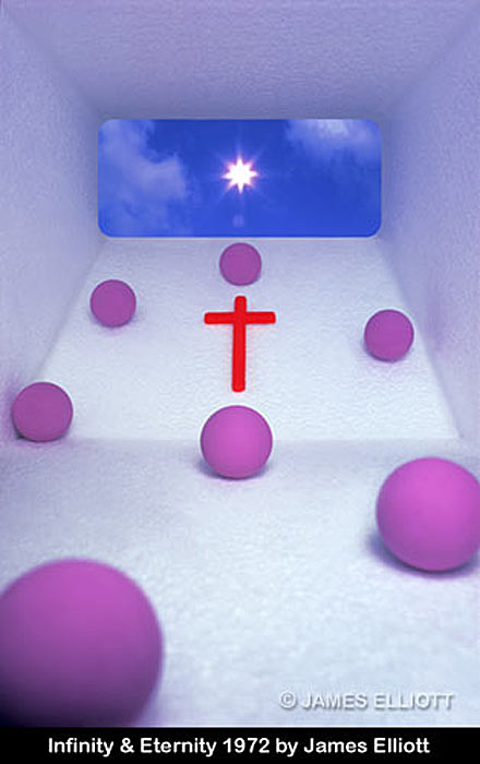 Of Madness, Metaphysics & Messiahs by James Elliott The 20th Century's most revolutionary work of photo art It is the world's first painted and sculpted photograph. The revolutionary 'Symphony For The Camera' took 332 hours of work to create. It introduces the concept of the epic photograph. Elliott created it without any assistance whatsoever, as with all his art. 'Tis well writ. For a photographer. If you paint a picture, photograph it and then destroy the painting - what do you have? And is it a work of art? And if not, why not? And if the degree of power, beauty, substance and gravitas in a photograph is greater than that of a painting, then which is the work of art? Back in 1974, in an age that did not consider photography Art, these were the sort of questions I constantly found myself asking. "Metasphere" is the world's first painted, photo-sculpture. In the years leading up to Metasphere I had been busy expanding the creative parameters of Photography as a medium and already created a lot of original work, but I loved the idea of a photograph, in which every square millimetre would be created by the artist. I wanted to create something amazing and take myself to the very limits of my capabilities. I was after all, only 23, and I had absolutely no idea what they were. Metasphere evolved out of the myriad of other things I was working on at the time. I was working on photo art day and night, subsequent to my epiphany that photography had not really been used to create great art. It had been used for everything else, but not that. In this whirlwind of creative activity, I needed neither financial incentive nor a tutor. It was pure passion. An astonishing metamorphosis from that teenage wasteland of indolence and indulgence, to that raging, workaholic fire which is inspiration. Photography had become my life. I did nothing else. In 1972 I had created an image entitled 'Infinity & Eternity'. A very ethereal, spiritual picture, which was one of my early artistic triumphs. It was at the time, a creative and technically ambitious picture, for me. Beyond previous endeavours. I created the entire scenario with the back end pointing towards the sky. I created the enclosure, spheres and cross and painted in the colours. It was literally created around the camera. No-one had done this before, with such autonomic control. I also had to balance the exposure of the sky with the lighting on my creation. Not an easy task, as it was created indoors and so had to be flooded with very bright light. To this day, I still think the colours are beautiful. And judging by people's reactions, it definitely captured the aura I was after. On reflection, it does occur to me that this may well be the world's first painted, photo sculpture and not 'Metasphere'.