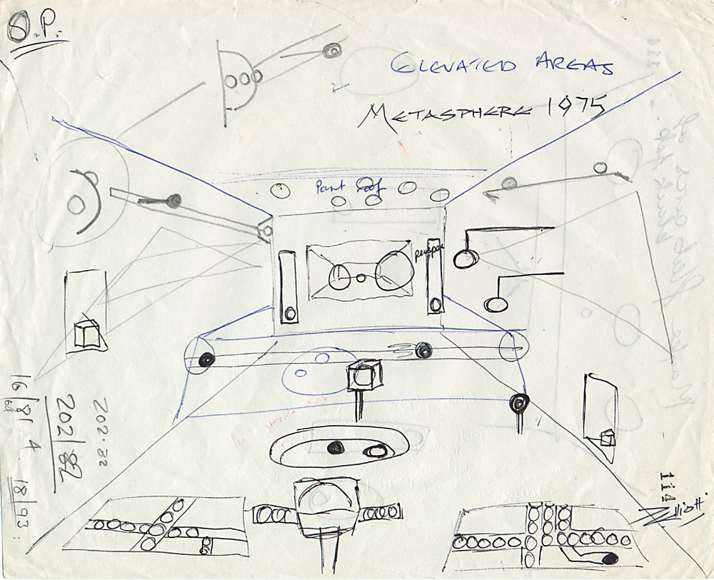 METASPHERE SKETCH This sketch is surprisingly close to what El actually created. Although clearly some ideas were dropped and others introduced as the masterpiece progressed. Midway through, Elliott noticed his Nikkormat FTN did not have a sufficiently precise viewfinder. He changed horses in midstream as it were and swapped it for a Nikon F2, about six weeks into Metasphere's creation. At the time the F2 was the only camera in the world with 100% accurate viewing. Essential to achieve the obsessive symmetry evident in the piece. Most people think it was done on 5 x 4 large format camera, but this would have been technically impossible, due to the restricted depth of field of such cameras. Elliott loves clarity and hyperfidelity and only rarely allows blur, if it can strengthen an idea, which it seldom does. |