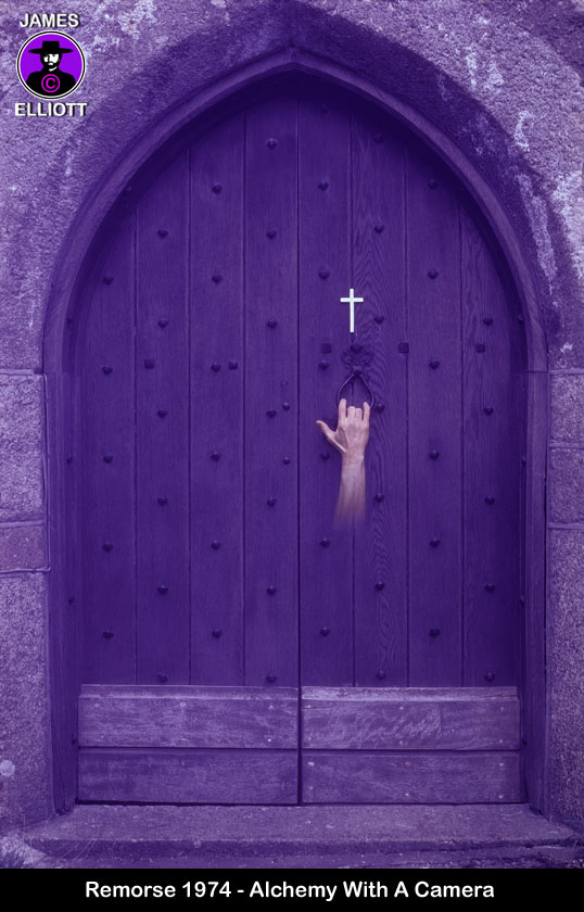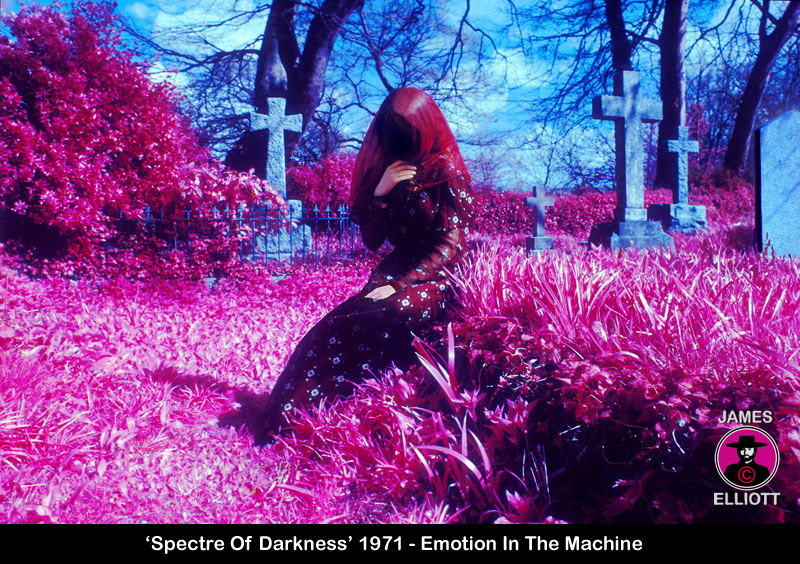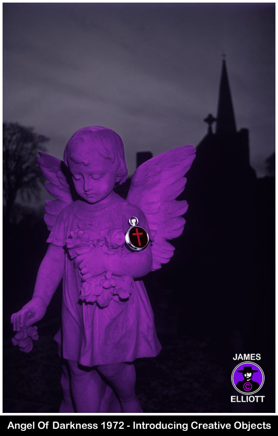 Apart from perspective stacking, time lapse and infra red, I also experimented with desynchronised flash, shadow coloration, colour filters, flash coloration, long exposures, atmospheric lighting and so on, but a significant change came when I started to introduce elements of my own creation into the images, whilst combining this with advanced techniques. A great example of this is 'Angel Of Darkness' of 1972, where I first created the 'death watch'. Then using desynchronised flash and colouring it purple. I let the background symbolically fall into darkness.