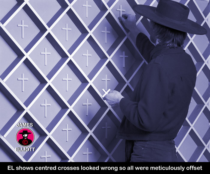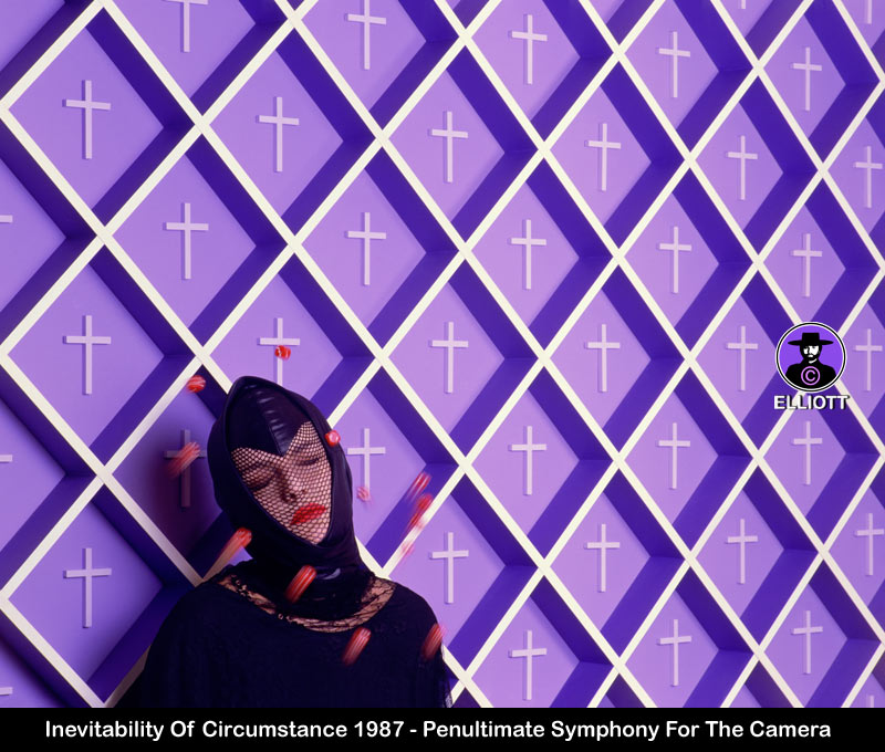 The most difficult aspect of creating 'Streetwalker Blues' was giving it a sense of dynamic spontaneity, which was not easy. Most of the 30 exposures were junk, but I achieved exactly the right dynamism towards the very end of the shoot. This was achieved in part by giving the picture a diagonal composition, which basically runs from top right to bottom left of frame. The strange thing about the dynamic of a shoot is that you build up a momentum until you reach an absolute climax and it is very common for the masterpiece to be last exposure on the roll of film or the penultimate. You subconsciously know when you have got it. I don't know how, but you just do. Upwardly Mobile There is nothing like moving studio to usher in new changes in one's life. After leaving my studio at Oxford Circus, in Regent Street, I had created a studio deep in darkest Cricklewood. I would in turn leave this location in 1986 and move to a new, largest ever studio in Belsize Park. The eponymous road not the area. The last two pictures I created in Cricklewood were both extremely important pieces. The penultimate piece was 'The Inevitability Of Circumstance (And The Fall Of The Dice)' of 1987. The later date is due to later completion, not actual shooting date, which was 1986. 'Inev Circ' as I referred to it, was an extraordinarily difficult piece to create and its creation is very well documented. Inspired by a tragic event I saw at the time, which caused me to ponder the philosophical riddle of Divine order versus random circumstance and chaos. Every cross has been offset using a positioning jig, so that from the camera viewpoint they all appear central. Normally the crosses would have progressively become obscured.
