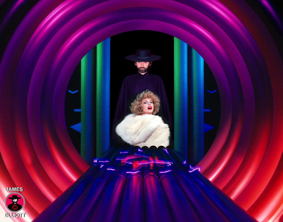 This self portrait was taken at a fairly advanced stage, although Elliott can still be seen to be questioning the idea of a hovering halo. In the end he decided this two colour, abstract light painting was too chaotic to match the beautiful order of the rest of the piece. So eventually this evolved into the halo. This image shows the model for the masterpiece, Elizabeth Caron, muse of 8 years at the time. Elliott moved home during creation of his masterpiece and had to sustain the upkeep of his existing studio for over two months, at not inconsiderable expense, to complete the photograph. |