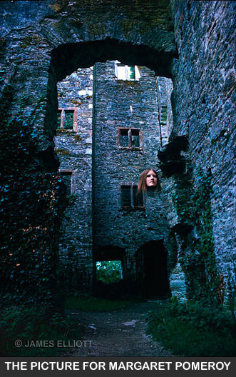 A Dark And Mysterious Tale Margaret Pomeroy was a woman of great beauty. But I would know none of this, for many years to come...... It was 1972 and my Gothic Work was blacking out everything else. I created nothing else in that year. Just images of death, atmosphere and spirituality. Some might say an unusual subject for an artist just out of his teens, but these things fascinated me back then. And so it was that I loved to adventure, searching high and low for places of inspiration and beauty. Surroundings where I could just feel something. Some days whilst out adventuring, I would take a different fork in the road, just for the hell of it. Just to see what was up there. One day in 1972 I discovered Berry Pomeroy Castle in this way. Or rather I discovered the entrance, for it had an unassuming gate. At first I thought I had drawn a blank and just sat there in the car, staring at the gate. But something in my head said "Try the gate" and so I did and amazingly, it wasn't locked. So I just drove straight in and on down the narrow road through the woods. I kept thinking 'I hope I don't meet another car, as I would not be able to pass or reverse.' But there weren't any other cars. Or people. 'A long and winding way down', I thought and as I turned a corner, the woodlands suddenly cleared and there it was before me. An amazing, spell-binding, but long forsaken castle. I just left the car in the middle of the road and jumped out. I thought "Oh my God this is incredible!" I gawked for a while and then logic told me to shift the car. So, I parked up. The castle was miles from anywhere and silent, save for the occasional squawking of the odd rook or raven and the distant hiss of a river. There wasn't a soul in sight, so I just wandered in and strolled around. I have no fear of ghosts or other strange goings on, as I don't believe in them. There is a side of me that wonders whether it is this firm disbelief, that keeps them from me, but that is a cerebral labyrinth and not something I shall dwell upon. Strange though, I thought, that most castles beam their impenetrability with pride from the highest of hills, whilst this one hides secluded, off the beaten track and down a long, winding road, obscured by vast woodlands. In the middle of nowhere! The atmosphere there was incredible and I thought "I will return." The castle is incredibly old. The Pomeroy family - then de la Pomerai - arrived with the Norman conquest (1066 and all that). I won't dwell upon the history as this was my "siesta subject" at school. But briefly, the castle was built by the Pomeroy's in the 12th Century and the family occupied it until 1547 when it was bought by Edward Seymour, Duke of Somerset. Around 1700 the Seymours moved to their Wiltshire estate and the castle fell to ruins. Some say there was a fire..... Anyway, I did return, later in 1972. I was just beginning to work with a girl called Trish as a model. It was early days and my style was just finding it's direction. Trish and I would go off to places I had discovered. Churches, graveyards, ruins and so on and I thought my new found castle would be an ideal location. The first image I ever shot at Berry Pomeroy Castle was called "The Veiled Silhouette" 1972 and features a silhouette of Trish in a long black dress, wearing a veil. The picture is dark and the moonlight shines from behind her head. It has a haunting timeless quality.